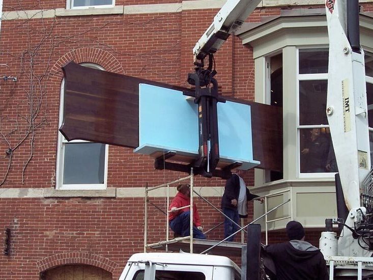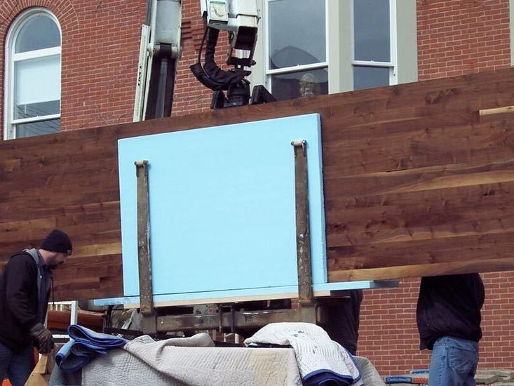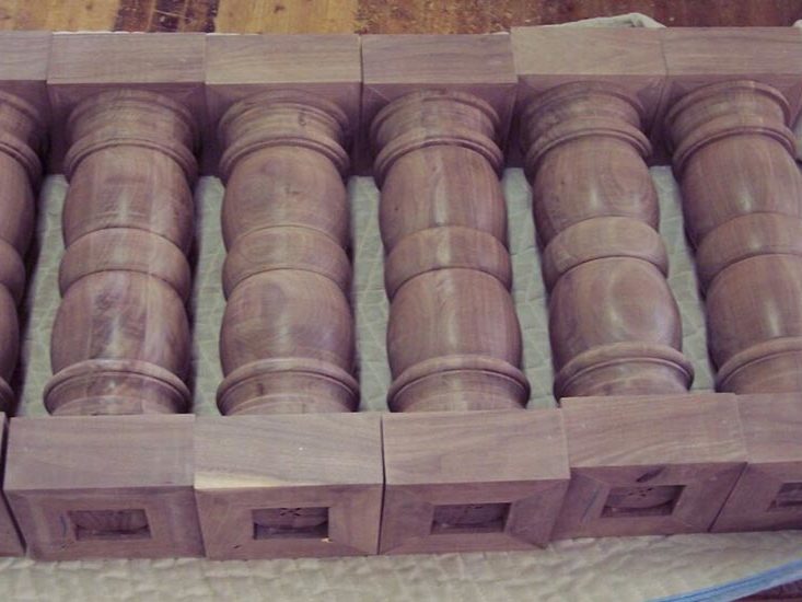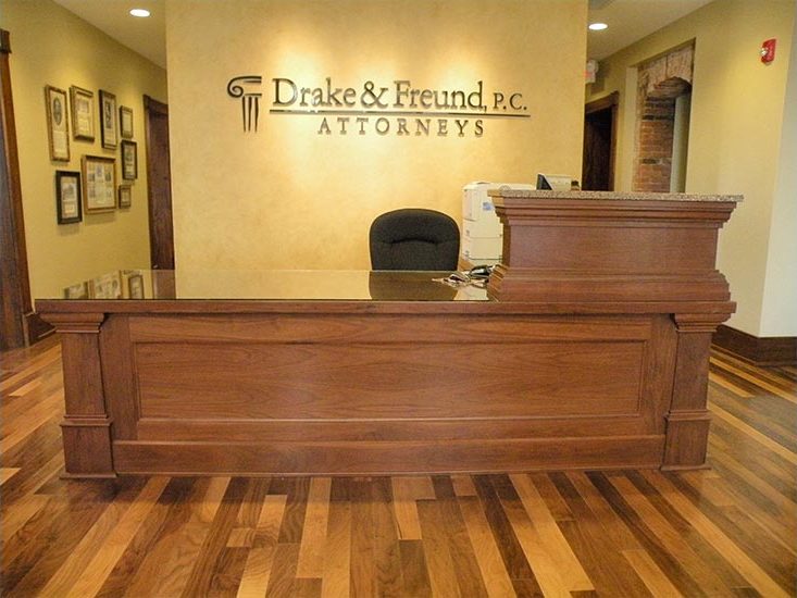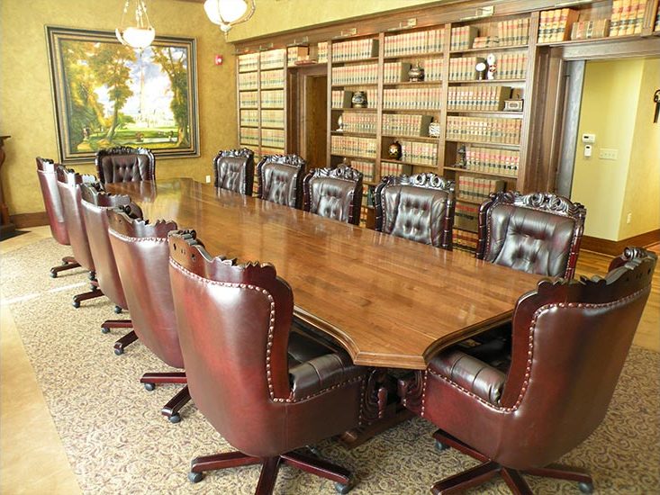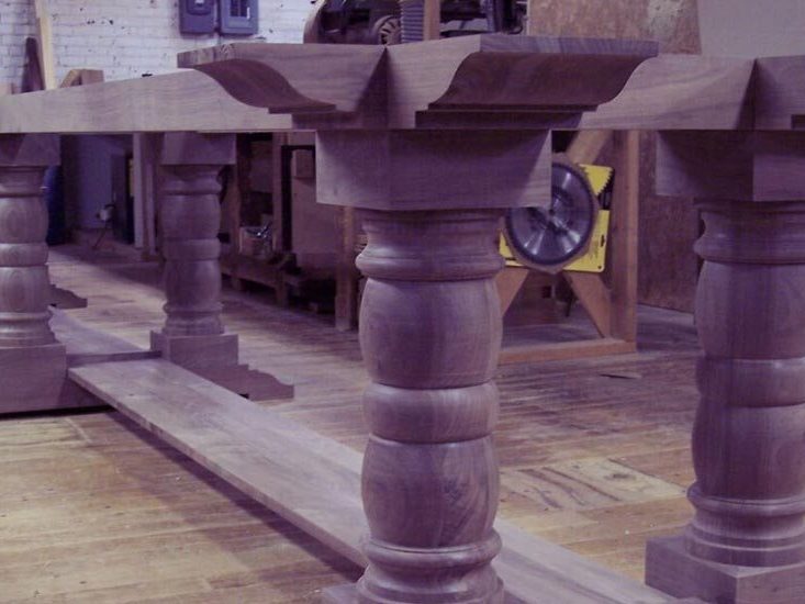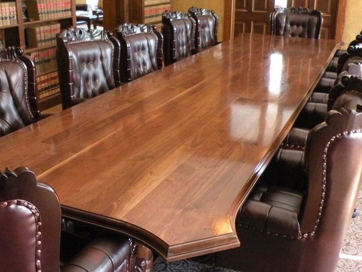 A customer contacted us to build a large conference room table as well as a desk for the receptionist. The table was fabricated from Solid Walnut supplied by the customer. The table is 17 foot long and has a design on the corners. The receptionist desk is also fabricated from Walnut.